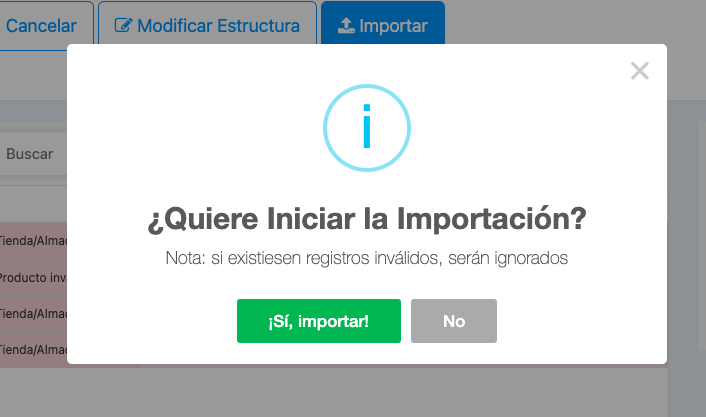 Si la línea de productos es rosa, significa que está mal. Si haces clic en el producto, podrás realizar el cambio manualmente. Si son varios productos, puedes cancelar la importación, corregir el archivo y subirlo nuevamente.