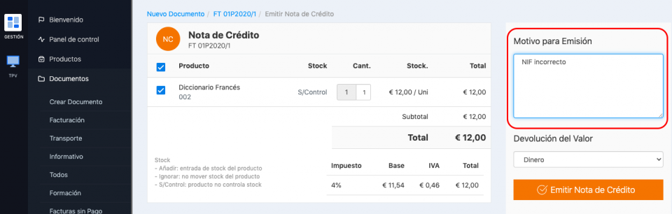 - Haga click en Emitir Nota de Crédito (en el lado derecho).
