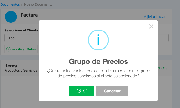 Cuando cree un documento con ese cliente, Vendus le preguntará si desea actualizar al grupo de precios asociado con el cliente.