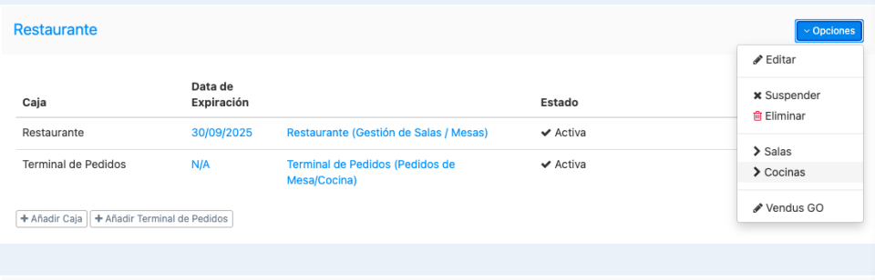 - A la derecha del nombre de la tienda, haga clic en Opciones y seleccione Cocinas;