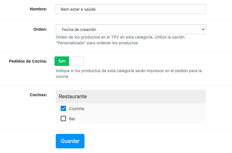 Puedes crear más de una cocina (local) y asociar determinadas categorías de productos a una cocina concreta. Por ejemplo, la categoría Bebidas de bar y la categoría Menús de cocina. Por lo tanto, cuando cree impresoras y las asocie con cocinas, los pedidos se imprimirán en la ubicación adecuada.