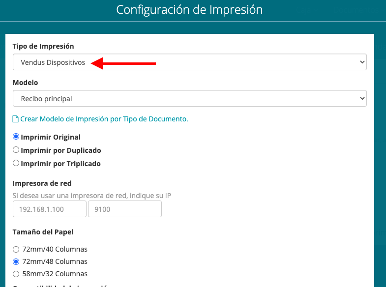 - Abre la aplicación "Vendus Dispositivos" y configure una Impresora de destino