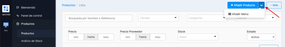 - Haga click en la señal del lado del botón verde Añadir Producto (esquina superior derecha) e seleccione Añadir Menú.