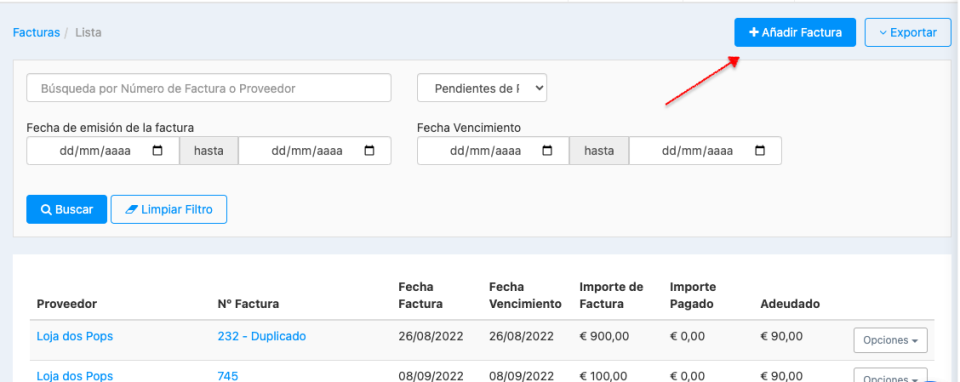 Para crear una factura, vaya a Gestión > Compras > Proveedores. Haga clic en añadir factura a la derecha. Se abrirá una página donde deberás ingresar la factura. Junto a esta opción también encontrarás Exportar, que te permite exportar el listado de facturas en formato CSV.
