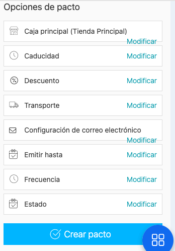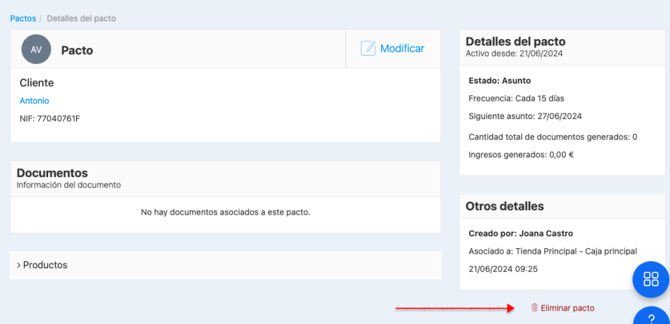 Si desea eliminar un Pacto que ya ha emitido documentos, vaya a Gestión > Documentos > Pactos y haga clic en el Pacto deseado. Verá la opción Modificar: haga clic.