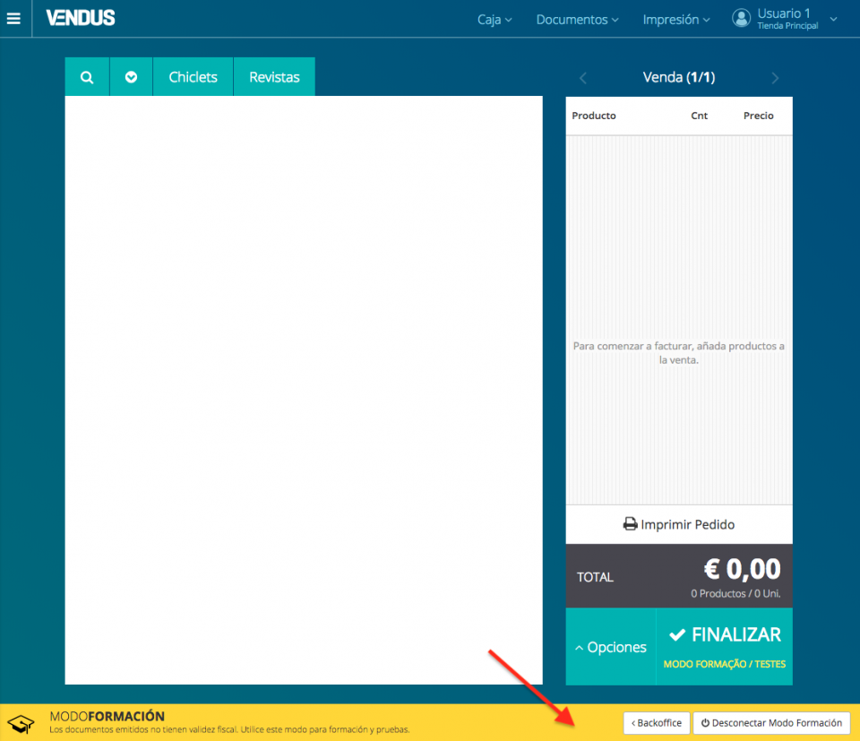 Este modo permite emitir documentos sin validez fiscal. Con la activación de este modo se simularán ventas reales, pudiendo probar el TPV/Backoffice y la emisión de documentos en la impresora. Cuando se crea una cuenta, este modo se activa automáticamente. A partir del momento en que se utilice Vendus como herramienta de facturación online, tendrá que desactivarse dicho modo, para que la emisión de documentos sea real y se pueda comunicar a la Agencia Tributaria.